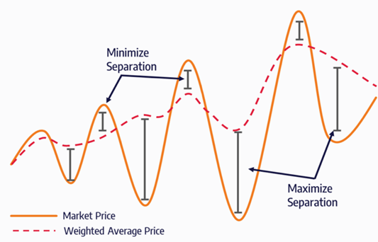 Check out the orange line in the illustration below and imagine that the market price is behaving similarly. As you well know, you need to sell your milk as soon as you produce it, and if you take the market price, you are also taking on the full volatility of the market. Yes, you get a higher price when you’re at the top end of the market. You also absorb low prices when times are bad. Although you might think your average price evens out over time, it’s harder to manage long-term investments or cover costs in hard times. Instead, strive to manage your price so that your average weighted price – the price you build over time as illustrated in the dotted red line below – moves you closer to the top of prices and further from the bottom.