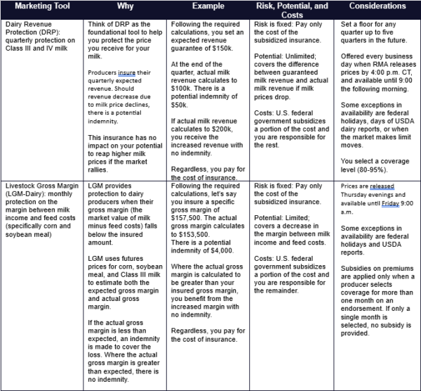 Managing the price you get for the milk you produce can make a big difference in the success of your operation, and it isn’t easy. You need to have a good plan of how you will layer the tools and at what prices you want to take action to build a better weighted average price. The first and best way to take action is to ask questions. Ask how the tools work and how to layer them in the current market environment. Ask what should trigger a decision to make an insurance claim or execute a put or call action. Build a plan that allows you to take advantage of what the market has to offer instead of being pulled in all directions by market action.