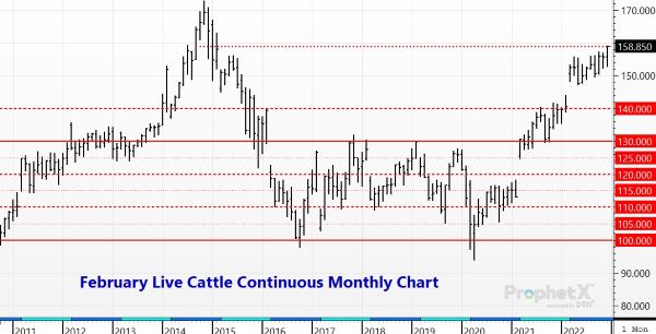 The live cattle contract continues to push to new highs as buyers have stayed active in the live cattle market going into the end of the year. The recent strong buying has been triggered by the confirmation of tight cattle supplies going into 2023 by last Friday’s Cattle on Feed report. This tight supply picture and a jump in retail carcass values keeps the live cattle market optimistic. Cash trade this week is starting to develop, and expectations are for trade to be firmer than last week. A strong move in retail carcasses, with Choice carcasses trading at $279.00 at midday on Thursday, have helped improved packer margins, allowing them to bid up for cash cattle. The sharp drop in temperatures last week and warm temperatures this week may impact feedlot conditions, making good weight gain difficult. With February closing at 158.850 on Thursday, that is the highest February close since November of 2015 as the trend in the near-term continues to work higher for live cattle.