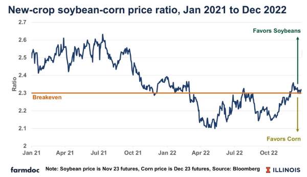 As the grain market is heading into the next round of USDA numbers after the report on Thursday, the focus will start shifting to the battle for acres between corn and soybeans for the 2023 crop. In evaluating current price ratios between corn prices and soybean prices, the market is currently more supportive of soybean acres over corn acres. Soybeans are benefiting from a good demand tone, South American weather, and a tight U.S. supply picture to help support prices. Corn, on the other side, is having some demand issues which have weighed on prices despite a relatively tight global supply picture. The price relationship in this ratio can be supportive of both the corn and soybean markets for the first half of the 2023 calendar year.