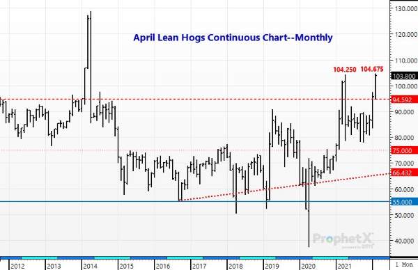 Apr hog futures traded to their highest point since 2014 and the PEDV rally in the hogs market, trading past last year’s post-COVID rally high. A strong demand tone and cash strength are helping push this market higher. Midday direct cash trade was firmer on Tuesday, gaining 4.75 to 76.58 on average with a high base price at $91.00. The Lean Hog Index traded 1.57 higher to 85.87. Pork carcass values were firmer at midday, with carcasses trading 1.06 higher, to 100.00. Within the primal cuts, the high-priced pork loin cuts are trading $104.00, over $20 higher than last year, and well above 5-year averages. The stronger demand tone helps support the market overall and provides the value needed to support the higher trending cash market. The trend in the market is still higher, and the buying strength remains. The hog market is searching for a top and is strongly overbought, but the fundamentals and carcass values still point to a higher trend.