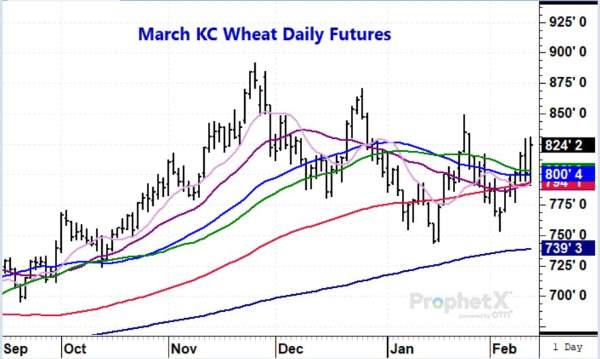 What started as a relatively boring day, turned into an explosion before the close. Wheat rocketed higher on renewed concerns of a Russian invasion of Ukraine. Though unconfirmed at this time, there were reports today that Putin does plan to invade Ukraine and communicated as such to the Russian military. The invasion is believed to begin sometime next week. Again, these are unconfirmed reports at this time, but it is noted that President Biden did suggest any U.S. citizens in Ukraine should leave. Paris milling wheat futures also closed sharply higher, around the equivalent of 22 cents. The U.S. Southern Plains look to remain dry for the next seven to ten days. There is some precipitation in the forecast with a front moving through, but the outlook suggests that the moisture will only hit the very eastern HRW wheat areas.