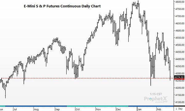 The escalating tensions in the Ukraine have the equity market testing its lowest point in months.  The S &P 500 futures were trading over 1.5% lower on the day and are currently pushing a 10% correction for the high established on January 4th.  The S &P 500 futures is looking to post its lowest close going back to July 19th this past summer.  The concerns over sanctions on Russia that could be arising as tension in the Black Sea region have escalated this week.  The potential impacts could result in strong energy and commodity prices, which will likely erode corporate profits.  The equity markets were already on the defensive as the Fed has been signaling a tighter monetary policy to help curb inflation pressures in the U.S. Regardless, the S &P 500 futures are challenging some key support levels, that could open the door to s round of technical selling if prices don’t hold support.