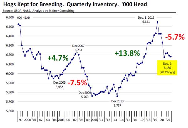 Hog market pushed to new highs for summer contract again on Monday, as the trade will be looking at the USDA Quarterly Hogs and Pigs report on March 30.  A key metric the hog market will be watching in the report will be the “hog kept for breeding” numbers.  The hog market is very aware of the tight current supply picture, but will be focused on possible expansion and growth in numbers going into 2023.  Despite strong hog prices, the impact of high feed costs, and potential uncertain demand tone due to inflationary pressure, the market is lacking clarity on the direction of the hog herd into the end of the year.  In December’s quarterly report, breeding hog inventory moved .1% higher than 2020, slowing the pace that producers have been moving breeding stock to slaughter.  In addition, current breeding stock slaughter data, the pace of slaughter of breeding animals has slowed.  Expectations are for hog numbers to flatten and possibly start building, as the strong hog market has incentivized producers to grow production, despite the strong grain prices.