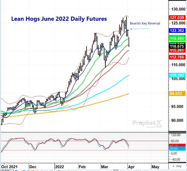 Jun lean hog futures have been in a steady uptrend since fall, in line with numerous other commodities. Higher feed costs, inflation, increased demand, higher energy prices, and disease issues have all provided support. There have been price setbacks, however, they usually have been in line with normal price fluctuations. On March 31, however, the market received a potentially ominous signal that a near, if not longer-term price top may be in place. A bearish key reversal was posted at the very top of a price peak. A bearish key reversal is when price in a period (in this case daily trade) exceeds the previous day’s high and low price and closes lower than the previous session. A reversal itself may not mean much; it is usually how the trade acts in a subsequent session. In other words, was the reversal merely a one-day event, or was there follow though? On the June lean hog chart, follow-through selling is suggesting traders are, for whatever reason, exiting longs, establishing new sell positions, or both. Bottom line, if June lean hog prices have topped, it should not be a surprise.