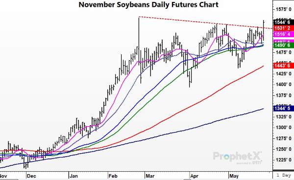 With grain markets struggling this week, the soybean market has held its ground, and on Thursday, saw strong buying support. Soybean futures surged higher on Thursday as Jul soybeans gained 45-1/2 cents and Nov soybeans added 32 cents, with both futures posting new contract high closes with the move. The strong bull spread tone in the market indicates favorable demand news as processers in the U.S. have been firming bids looking for cash soybeans. In addition, weekly export sales saw another good week with a mixture of old and new crop sales. Even though China canceled 4 million bushels of old crop soybeans, the export report saw a good variety of non-traditional buyers, reflecting the concerns on soybean supplies. Rumors have been in the market that China has been looking for more old crop supplies in the August time window, but nothing recently has been reported on daily export announcements. Beyond old crop supplies, the market is watching the weather and planting pace for soybeans in the northern Plains. North Dakota and Minnesota are well behind pace, and long-range forecasts are calling for additional precipitation in the next week, which could really tighten the planting window. While the wheat and corn markets have struggled this week, it is apparent that money flow wants to support the soybean market, given the global supply/demand outlook.