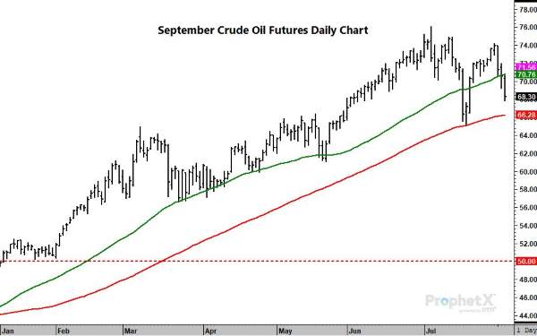 Crude oil futures traded strongly lower on Wednesday, and prices broke support levels and are poised to challenge recent lows. The oil market has been under pressure from the spread of the Delta variant of COVID internationally, and the prospects of a tightening demand picture, building supplies. The weekly Energy Information Association (EIA) report released on Wednesday only helped add to the fears of building supplies. On Wednesday, oil prices fell for the third day in a row to a two-week low on a surprise build in U.S. crude stockpiles, negative U.S. economic reports, and worries the spread of the coronavirus Delta variant will weigh on global energy demand. The EIA report stated crude stockpiles rose by an unexpected 3.6 million barrels last week, above analyst expectations. Technically, charts are set up for additional long liquidation, as prices will likely target the 100-day moving average on the September contract, near the $66.00 a barrel level.