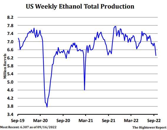 In June, when equities sold off, it appeared the entire commodity complex sold off with it. In part, this may have been funds exiting commodities as they potentially were over-weighted to commodities in their portfolios. One must wonder if this is not happening again. Commodities, especially row crops, are at a high price historically and perhaps for good reason; supplies remain tight. Yet, if demand is hand to mouth and commodities (all else being equal) are more costly to importing countries on a practically daily basis, then we are not surprised futures are on the defensive. The dollar has gained over 6% since September 13. The Federal Reserve raised interest rates 0-3/4 point last week but analysts argue it is not enough. Inflation continues to remain strong. Early harvest results are mixed with some better and some worse than expected. As the week wears on, there will be more information from farmers the market can grab on to. For now, we will argue it is about as expected. A good crop, but not a great crop. Quarterly Grain Stocks are due for release on Friday.