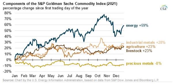 Commodity markets had a banner year in 2021. Multiple sectors posted strong gains as buyers stepped into the commodity markets. The components that make up the Goldman Sacs commodity index reflected those gains, with only the precious metals sector pulling a lower trade during the year. The index is heavily weighted on energy markets, and the energy markets tallied a 59% gain over the year as strong demand returned into those markets. Agricultural markets (grains/cotton) posted a 23% gain, supported by strong demand and weather concerns. Livestock markets added 23% as well, reflecting good product demand and overall product supplies. In addition to individual stories, commodity markets were the backside of the inflation play, reflecting the inflation growth in the U.S. and globally. A lot of the same components are still in place for commodity markets going into 2022, so the potential for additional gains is a possibility.