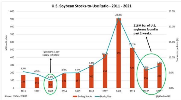 SOYBEAN HIGHLIGHTS: Soybean futures plunged 30 cents on a negative USDA Supply and Demand report and long liquidation reaching their lowest level since March 30. Carryout, at 320 mb, was 31 mb higher than the pre-report average estimate and 73% more than the September estimate of 185 mb.