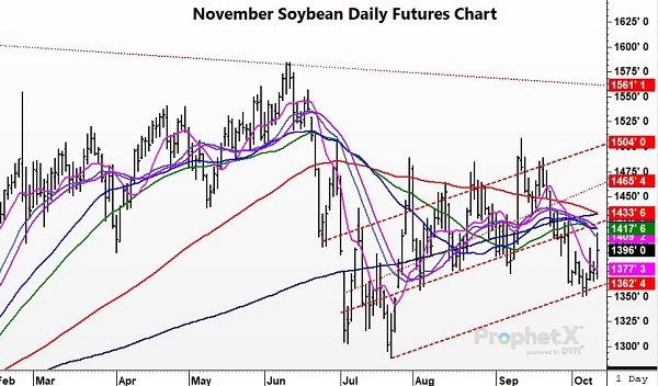 The USDA Crop Production report can bring surprises, and the October report delivered one for the soybean production. The USDA lowered soybean yield to 49.8 bushels/acre, well below the expectations of a slight bump in yield to 50.6. This took nearly 80 million bushels off the expected production for the U.S. crop this fall. This easily absorbed the additional 30 million bushels the USDA found on the most recent Grain Stocks report. After a couple of demand adjustments for crush and exports, the USDA left soybean carryout at 200 million bushels for the marketing year, unchanged from the September outlook. The analysts were expecting supplies to increase to nearly 250 million bushels. This was friendly for the soybean market, lifting prices higher on the day, but more importantly, keeping the supply picture extremely tight going forward.