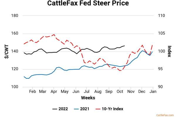 Cash live cattle prices have been on a steady climb recently, and last week posted a new high for the year. Despite concerns in the livestock markets regarding the economy and consumer demand due to possible recession, the cash cattle market has helped stay supportive of cattle prices. Last week, the average cash trade was slightly above the $146 level, pushing to new highs for the year. The cash market has been supported by good demand for export beef, and the demand for higher quality beef. Last week, the choice/select spread traded over the $30.00 mark between the two, signaling a demand for higher-quality beef, which helps support the cash market. This demand looks to stay in the market, and the cattle market looks to be current, keeping the packer active in trying to find higher-quality beef. This should support the cash cattle market into the end of the year.