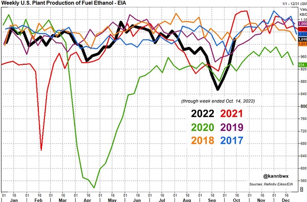 U.S. ethanol production jumped to a 10-week high last week as production ramped up seasonally. Production last week reached 1.061 million barrels/day, up 19% from three weeks ago. The biggest impact is the ongoing harvest bringing fresh supplies into ethanol plants. Production dropped aggressively through August and September as corn supplies were tight, and prices were high, and ethanol producers limited usage. The USDA has made downward adjustments to the corn totals used for ethanol for the new marketing year, adding to a demand concern in the corn market. Now, as fresh supplies are available, ethanol producers are ramping up production. The biggest concern for ethanol is the large ethanol stockpiles, and the limit demand for gasoline that may limit the ethanol usage.