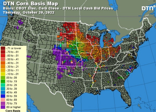 As corn harvest rolls on in the U.S., the market is closely watching the basis being paid for those fresh corn supplies.  The basis maps strongly reflect the current issues across the country and its impacts on the cash corn market.  The West is very strong, reflecting the poor crop across the region and the demand for feed to provide supplies to the livestock and ethanol industries in that area.  The central and eastern U.S. are being pressured by the poor water levels on the Mississippi River and associated watershed as supplies are backing up due to slow grain movement on the river.  Going forward, the supplies of available corn nationally are still extremely tight, and the key for the cash market may likely be based on the ability to move bushels from East to West versus South down the river.  The national corn basis is trending well above 5-year averages, showing the impact of tight supplies and the need in domestic demand.  The corn basis nationally is friendly for the corn market going into the second half of harvest.