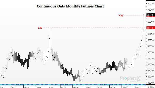 The oat market hit another historical price that crossed the $7.00/bushel level for the first time in history. It is well known that the oat marker and spring wheat market price rallies are being fueled by the overall tight supply picture from this summer’s difficult growing weather. Earlier in the week, spring wheat raced through the $10.00/bushel barrier, targeting further upside. On Tuesday, oats took the next step to push through the $7.00 mark. The month of October has been explosive in price, as the lead month December contract has gained $1.24 this month, closing on Tuesday at $7.06. Prices for the oat market are now in uncharted territory, and if prices can maintain above this price point, will likely push higher as these two grains are trying to buy acres for the next growing season versus each other. Prices at these levels are more likely speculative driven and will be extremely volatile, open to sharp price moves.
