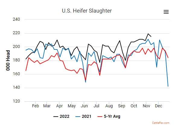 One of the factors that has kept live cattle supplies fairly heavy in the recent month has been the impact of heifers going to slaughter. For most of the year, beef heifer slaughter has been running at a strong pace year-over-year, and well above the 5-year average. Last week, heifer slaughter pushed 215,000 head, 12,000 head over last year, and over 20,000 above the 5-year average. The impact of difficult pasture conditions and tight margins has forced producers’ hands in pushing heifers into feedlots versus back into the breeding herd. This has increased placement numbers and kept available animals for slaughter relatively consistent despite tight cattle numbers. At this point, producers are still avoiding pulling heifers back into the shrinking cow herd, but that trend could change. If that does occur, we will start seeing breeding stock numbers increase, and tighten even further the total cattle on feed, which could be supportive of longer-term prices.