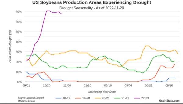Though planting is a long way off for the next crop of U.S. soybeans, one trend that will be closely watched is the areas impacted by drought. As of this week’s drought monitor, 68% of U.S. soybean acres are experiencing some form of drought as we move into the winter months. This is significantly above last year’s and most historical levels. Last year in this time window, acres in drought were at 17%, peaking to 37% in March and again to 31% in the summer. That weather impacted the crop with below-trendline yields. The recent dryness has accelerated since September, and U.S. soils in many areas are lacking water supplies overall. The winter and precipitation will be key to replenishing soils going into next spring’s planting window.