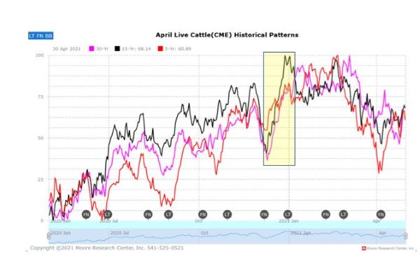 Cattle futures may be looking to post a seasonal turn despite a weaker fundamental picture. Historically, April live cattle futures trend higher from early December until the end of the calendar year, and cattle futures posted a bullish technical turn on charts to start the week. Cattle futures have pulled back seasonally after the Thanksgiving holiday, as futures have traded lower of the highs of November 24. Retail beef values have slipped. Last week, the cash market traded steady to lower for the first time in a handful of weeks. As the futures market works through December contract expiration, money seems to look toward the spring months and possibly trend toward a winter high. The overall cattle numbers stay supportive, and tighter cattle supplies should support the market. Beef demand is also strong, and that should be an underlying theme throughout next year.