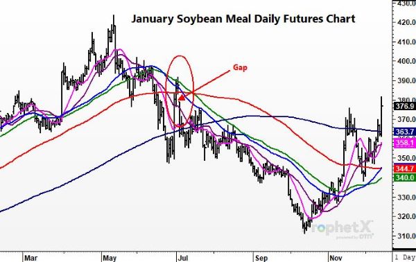 Soybean meal rallied to its highest price levels since July, fueled by technical buying and weather concerns. January soybean meal posted strong double-digit gains on Tuesday, pushing to a new near-term high and challenging July prices. Back in July, soybean meal prices broke lower, leaving a gap on the daily chart. Those gaps are magnets for prices to move to fill. The strong move higher in soybean meal on Tuesday pushed prices into that gap. The breakout to new near-term high triggered short-covering and technical buying. In additional, ongoing weather talk regarding a dry Argentina in January and February is helping add some weather premium into the soybean meal market.
