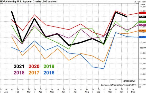 The U.S. NOPA crush number for November were the second-best total for the month of November. NOPA released a crush estimate of 179.462 million bushels of soybeans used for crush capacity. This was 0.9% lower than last November, which was a record crush month for November. The total was slightly below the 181.64 million bushels that the market expected but well within expectations. Soyoil stocks posted their first monthly decline since June at 1.832 billion pounds as oil yields were down, the lowest since last February. The soybean product market, soyoil and soybean meal, has been extremely volatile in recent session with wild swings in both markets. The demand for both products will continue to support the NOPA crush totals going forward and provide positive support of soybean prices.