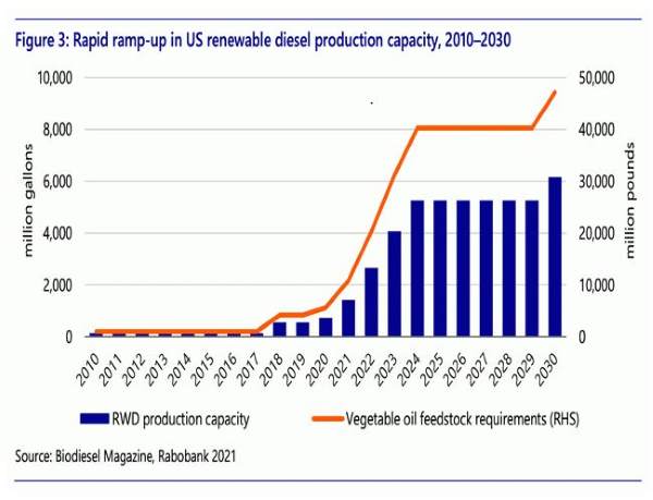 Plans for renewable bio-diesel could be a boom for soybean prices, boosting domestic demand. Talk in markets has been trying to plan out the potential soybean needs for a proposed boom in bio-diesel demand in the years ahead, as the U.S. ramps up production for a more green energy focus. Soybean oil is figured to show increased demand in 2022, as crushing plant projects are being constructed, which will increase the domestic demand for soybeans. The list of proposed and under-construction renewable diesel facilities around the country would spike production from 770 million gallons in 2021 to at least 3 billion gallons in 2023. EPA already forecasts 2022 production at 1.59 billion gallons. This leap in potential production will put soybeans and soybean acres in high demand in the years going forward. As the U.S. struggles with global competition for soybean exports, a boost in domestic demand through new bio-diesel project could have a strong impact on the U.S. soybean market.