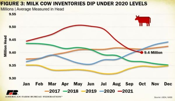Milk prices, overall, remain strong going into the end of 2021, fueled by a record export demand pace. A big concern has been the dairy cow numbers and the size of the U.S. herd versus previous years. On this week’s USDA Milk Production report, 2021 milk cow inventories dropped below 2020 levels for the first time in October. A reduction of 14,000 head from production from October 2020 resulted in an 88,000-pound (0.5%) drop in milk production. Despite overall supportive prices, the impact of higher input costs, and feed cost may have had dairy producers move some animal out of production. This trend may be a key to the support in the milk market in 2022, especially if the historically strong demand can be maintained.