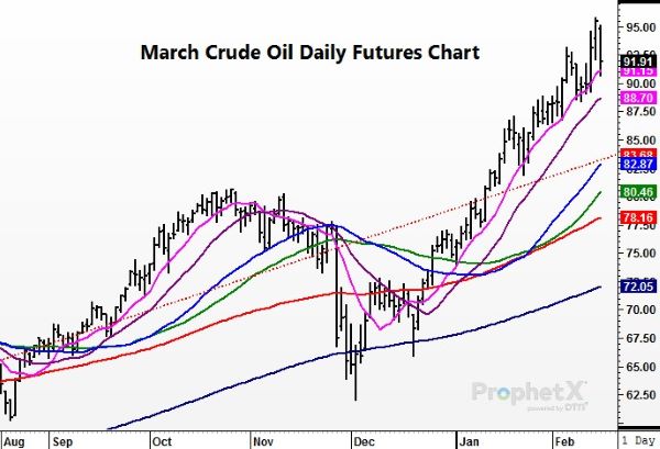 The crude oil market tumbled nearly 4% on Tuesday as the tensions between Russia and the U.S. over the Ukraine saw some easing. The ongoing concerns of a possible escalation in the Black Sea region helped support oil prices, as the front month March contract traded to a multi-year high at $95.00 a barrel. The possible tightening of an already tight global supply picture brought money flow into the crude oil and other commodity markets. As tensions seemed to cool, money was moving to the sidelines on Tuesday in most commodity markets, led by the weakness in crude. Price are challenging near-term support, but this market and others may be led by the technical trade versus the fundamental trade.