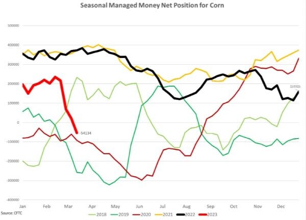While the information from the CFTC regarding the Commitment of Traders has been delayed due to a ransomware attack, the managed funds positioning on corn has been liquidated. For the latest report for March 14, the managed funds have moved to a short position in corn of 54,134 net short contracts. This position is down a net 288,000 contract from a net long of 215,928 net long positions on the Feb 19 report. This was a historic sell-off as the fund grew an aggressive short position while liquidating held long contract. The fund has been influenced by the concerns of a growing supply of corn as demand concerns have seen the USDA add bushels to the ending stocks. In addition, the macro-economic environment has turned negative and deflationary, pressuring the commodity markets in general. The recent concerns regarding the stability of the banking sector have added to the “risk-off” mindset.