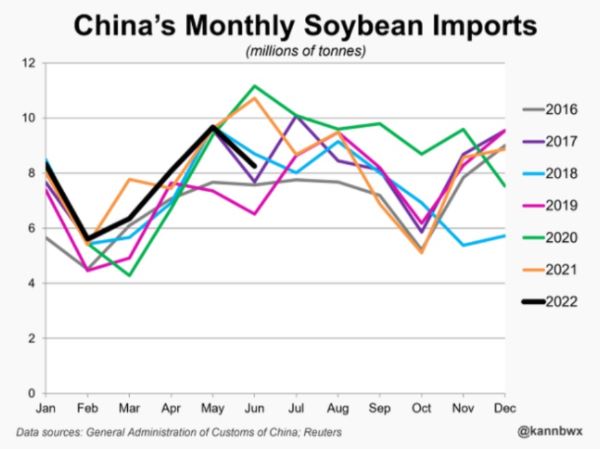 China’s monthly soybean imports have been trending lower, confirmed by June export totals. For the month of June, China imported 8.25 MMT of soybeans, which was a 3-year low for the month. This total was also down 235 from last year’s June totals. Poor soybean crush margins and lower hog inventories have been a major factor in the Chinese appetite for global soybean imports. In addition, high global prices and transportation costs have impacted soybean shipments, keeping the Chinese end users more current in their demand. For the year from January to June, total imports are at 46.3 MMT, which is down 5.5% year over year. Concern regarding Chinese soybean demand has been a limiting factor in soybean prices recently, as the market is cautious that adjustment could be coming on export expectation, which could increase the overall supply picture.