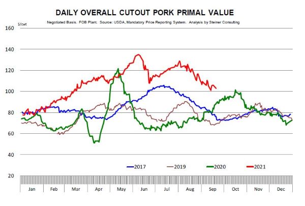 Pork cutout values have tumbled off the highs for the year but may be finding some stability. The key fundamental in the lean hog futures market is the value of the pork carcasses. Prices have steadily dropped off the high from earlier in the year and weigh on lean hog futures. Pork carcasses were trading over $130 in June, when hog futures markets were also trading over the $100 level. The strong demand was led by good domestic demand and an active export market. A large portion of the export demand was led by China and its demand for pork supplies. Since the peak, export demand has tailed off, especially in China, as the domestic pork values have slipped, and their supplies have built. In the U.S. demand has stayed supportive, but COVID concerns have brought some caution into the U.S. market. Pork values have given back over $30 of value but recently have seemed to find some footing at the support of the $100 level. Historically, this is still a good value for pork products, trading well above previous years and market averages. If pork values hold in this area, that should be longer term supportive of hog prices as we move into the end of the year and 2022.