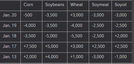 The player sheet for Jan. 20 had funds: net buyers of 3,000 contracts of SRW wheat, sellers of 500 corn, buyers of 3,500 soybeans, sellers of 3,000 soymeal, and sellers of 3,000 soyoil.