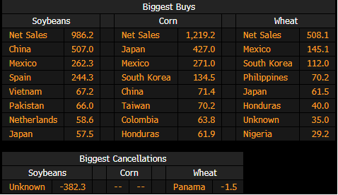 US Export Sales of Soybeans, Corn and Wheat by Country