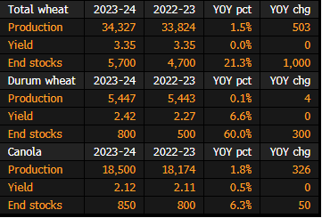 Canada 2023-24 Crop Production, Reserves Estimates: AAFC