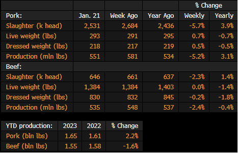 - Beef production down 2.4% from a week ago, cattle slaughter falls 2.3%
