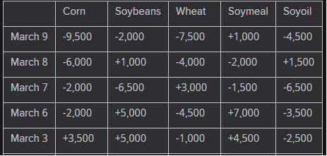 The player sheet had funds net sellers of 7,500 contracts of SRW Wheat; sellers of 9,000 corn, sellers of 2,000 soybeans, buyers of 1,000 Soymeal, and; net sellers of 4,500 lots of Soyoil.