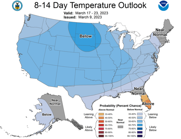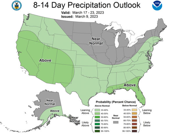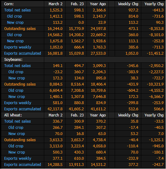 Preliminary changes in futures Open Interest as of March 9 were: SRW Wheat up 12,675 contracts, HRW Wheat up 1,984, Corn up 26,971, Soybeans up 5,365, Soymeal up 3,005, Soyoil up 10,626.