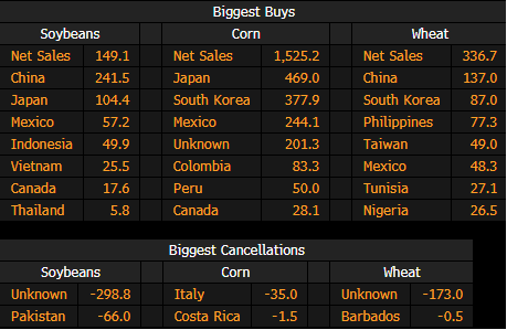 US Export Sales of Soybeans, Corn and Wheat by Country