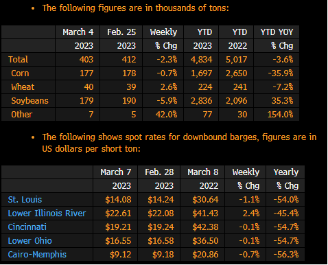 Barge shipments down the Mississippi river declined to 403k tons in the week ending March 4 from 412k tons the previous week, according to the USDA’s weekly grain transportation report.