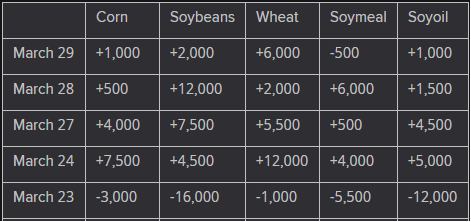 Preliminary changes in futures Open Interest as of March 29 were: SRW Wheat up 1,417 contracts, HRW Wheat down 2,556, Corn down 8,197, Soybeans up 8,540, Soymeal up 583, Soyoil up 4,952.