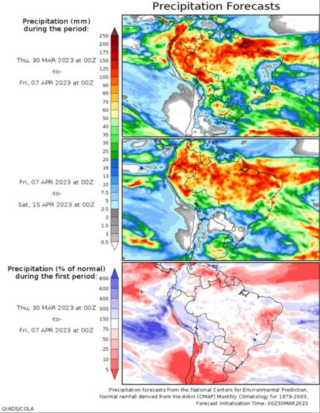 Brazil Grains & Oilseeds Forecast: Wet season showers have become isolated through central Brazil and are forecast to remain that way through April, leaving some concern for enough available soil moisture for developing safrinha corn. Systems moving through Argentina will bring showers into southern Brazil, however, which may enhance showers there at times.