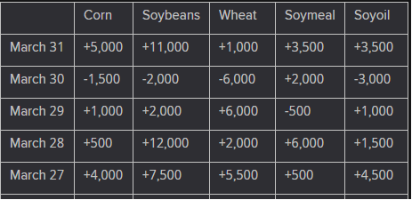 The player sheet for 3/31 had funds: net buyers of 1,000 contracts of SRW wheat, buyers of 5,000 corn, buyers of 11,000 soybeans, buyers of 3,500 soymeal, and buyers of 3,500 soyoil.