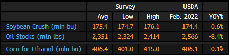 • Soybean crush seen at 175.4m bu in Feb., a 0.6% rise from a year ago