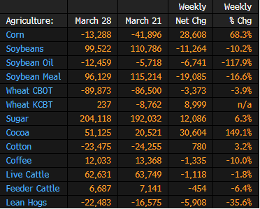Preliminary changes in futures Open Interest as of March 31 were: SRW Wheat up 60 contracts, HRW Wheat up 197, Corn up 3,164, Soybeans down 5,366, Soymeal up 8,213, Soyoil up 3,737.