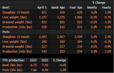 US federally inspected beef production rises to 535m pounds for the week ending April 1 from 515m in the previous week, according to USDA estimates published on the agency’s website.