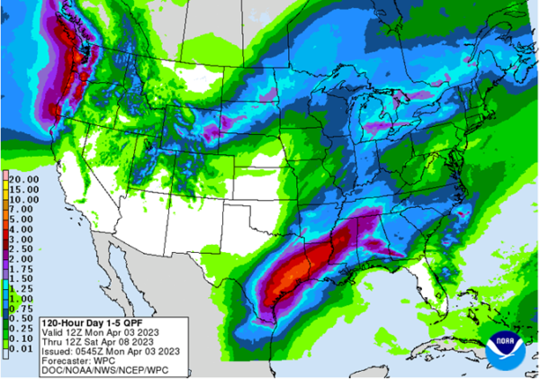 Delta Forecast: Another round of severe thunderstorms and severe weather moved through last Friday. Storms will move through Sunday night followed by another round of scattered thunderstorms and potential severe weather on Wednesday. The front to this system will likely stall in the region, continuing showers through the weekend, especially across the south. Wet soils are keeping fieldwork and planting slow.