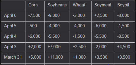 The following table shows US export sales of soybeans, corn and wheat by biggest net buyers for week ending March 30, according to data on the USDA’s website.