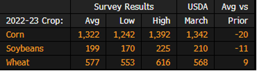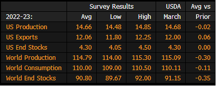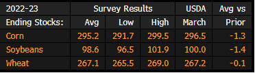 US Corn, Soy, Wheat Ending Stocks Survey Before USDA WASDE