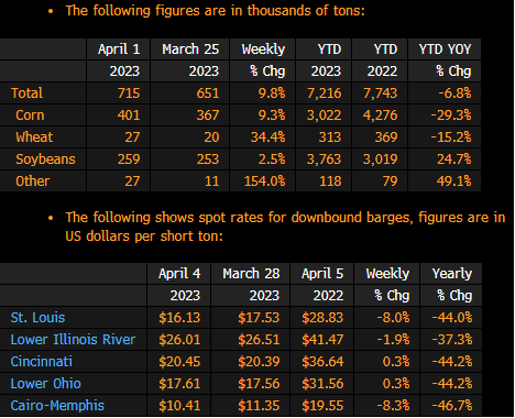 Barge shipments down the Mississippi river increased to 715k tons in the week ending April 1 from 651k tons the previous week, according to the USDA’s weekly grain transportation report.