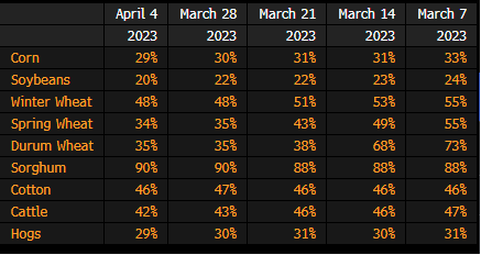 The following table shows the percent of US agricultural production within an area that experienced drought for the week ending April 4, according to the USDA’s weekly drought report.