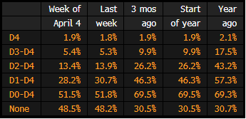 The following table shows the percent of overall land area in the lower 48 states in various drought conditions: Severe (D2) to exceptional drought (D4) for week ending April 4.